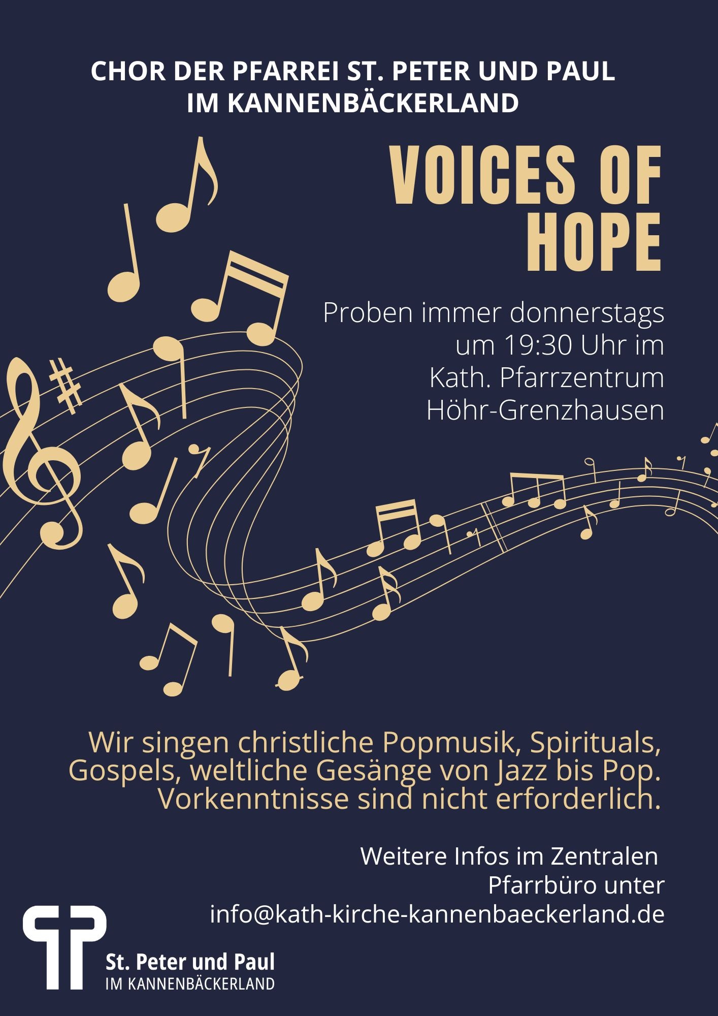 Der Chor probt jeden Donnerstag um 19:30 Uhr bis 21:00 Uhr im katholischen Pfarrzentrum St. Peter und Paul in Höhr-Grenzhausen.