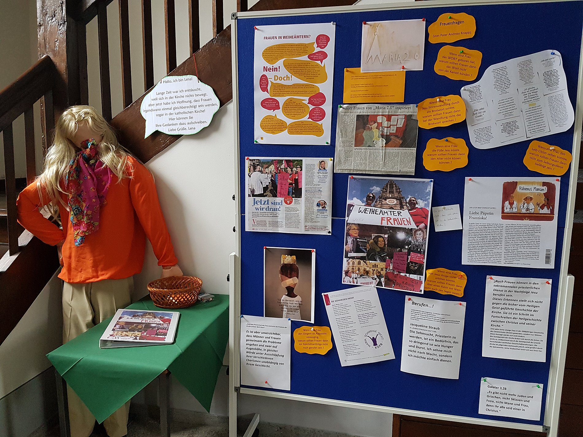 Auch in unserer Pfarrei gibt es eine Gruppe von ca. 25 Personen, die sich für die Zulassung von Frauen zum Priestertum einsetzt, wir nennen uns "Frauen und Männer gleichberechtigt in der Kirche" und haben uns dazu entschieden, die Thesen auch in unserer Pfarrei zu veröffentlichen.