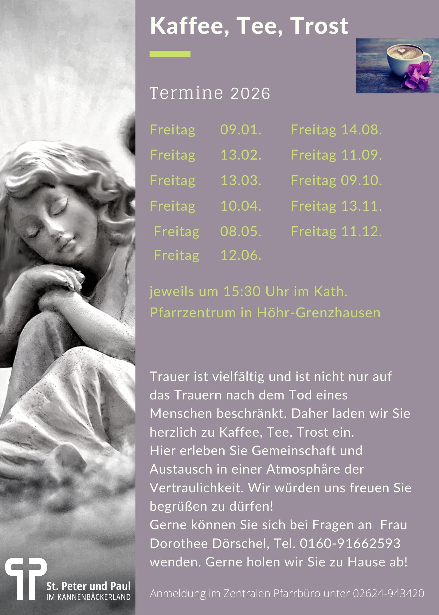 Daher laden wir Sie herzlich zu Kaffee, Tee, Trost ein. Hier erleben Sie Gemeinschaft und Austausch in einer Atmosphäre der Vertraulichkeit.