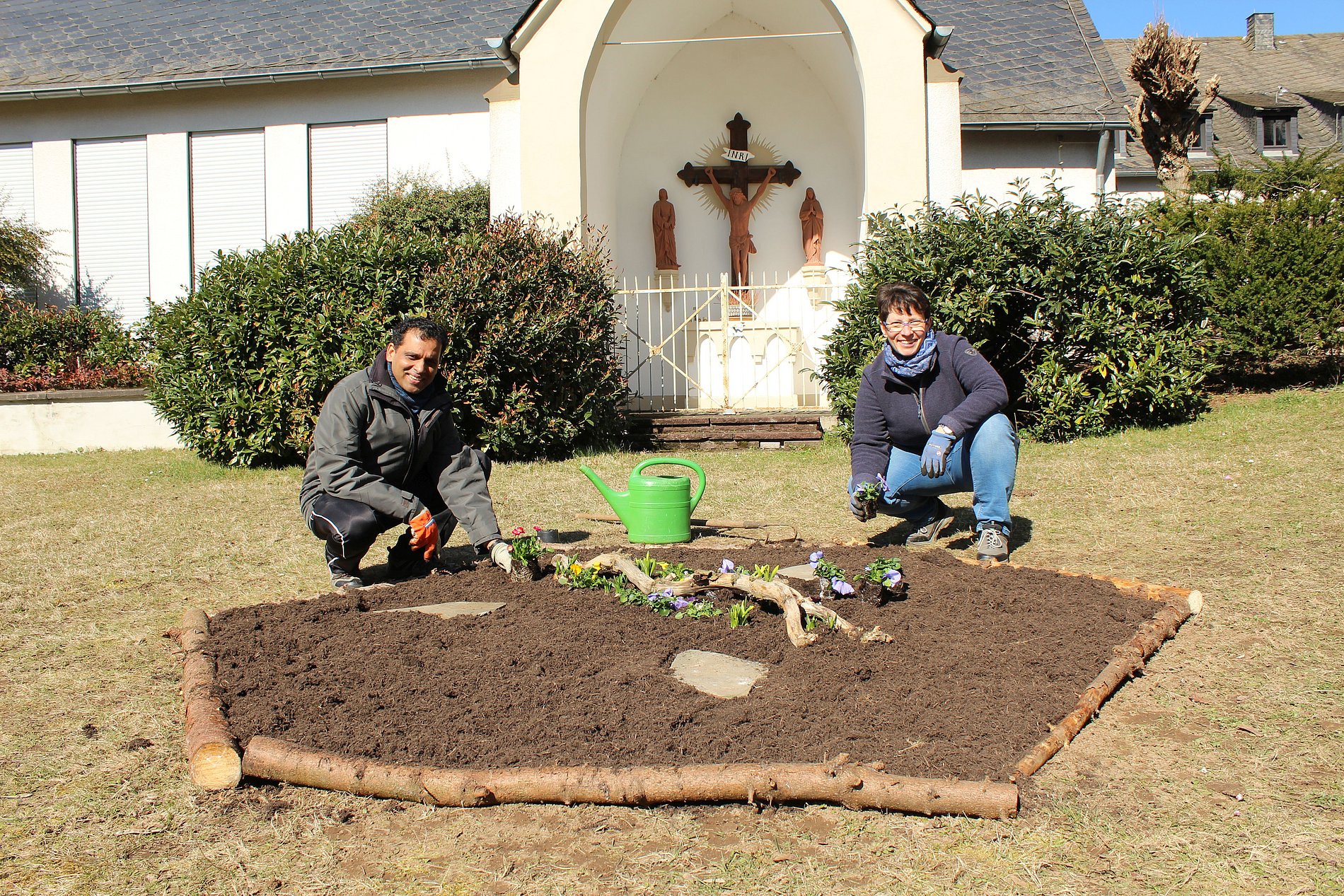 Kinder aus Schulen und Kitas, Bewohner der Caritas Wohnheime, Kommunionkinder, Vertreter der Seniorenheime, Große und Kleine aus der Pfarrei brachten Farbe in die Beete, bunte Blumen, Danksätze für Erlebnisse mit Menschen und mit Jesus, Ostereier und Hoffnungsbotschaften. Oster- und Lebensfreude wurde für alle sichtbar.