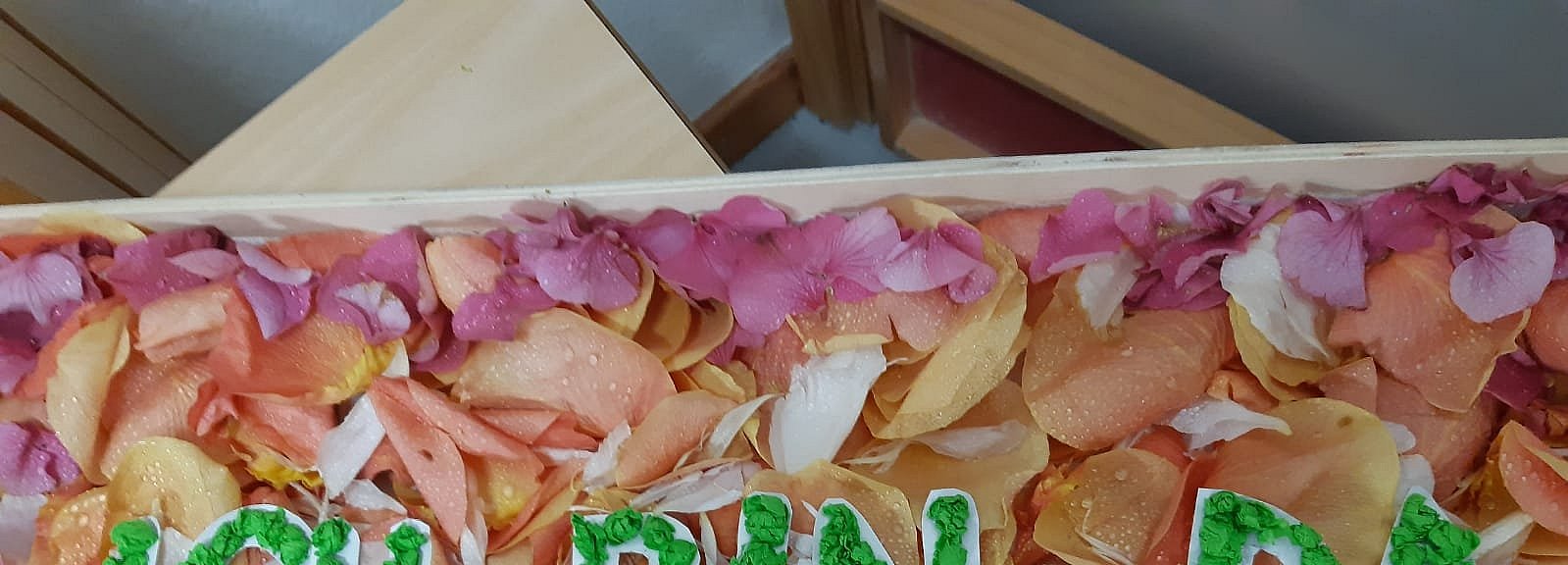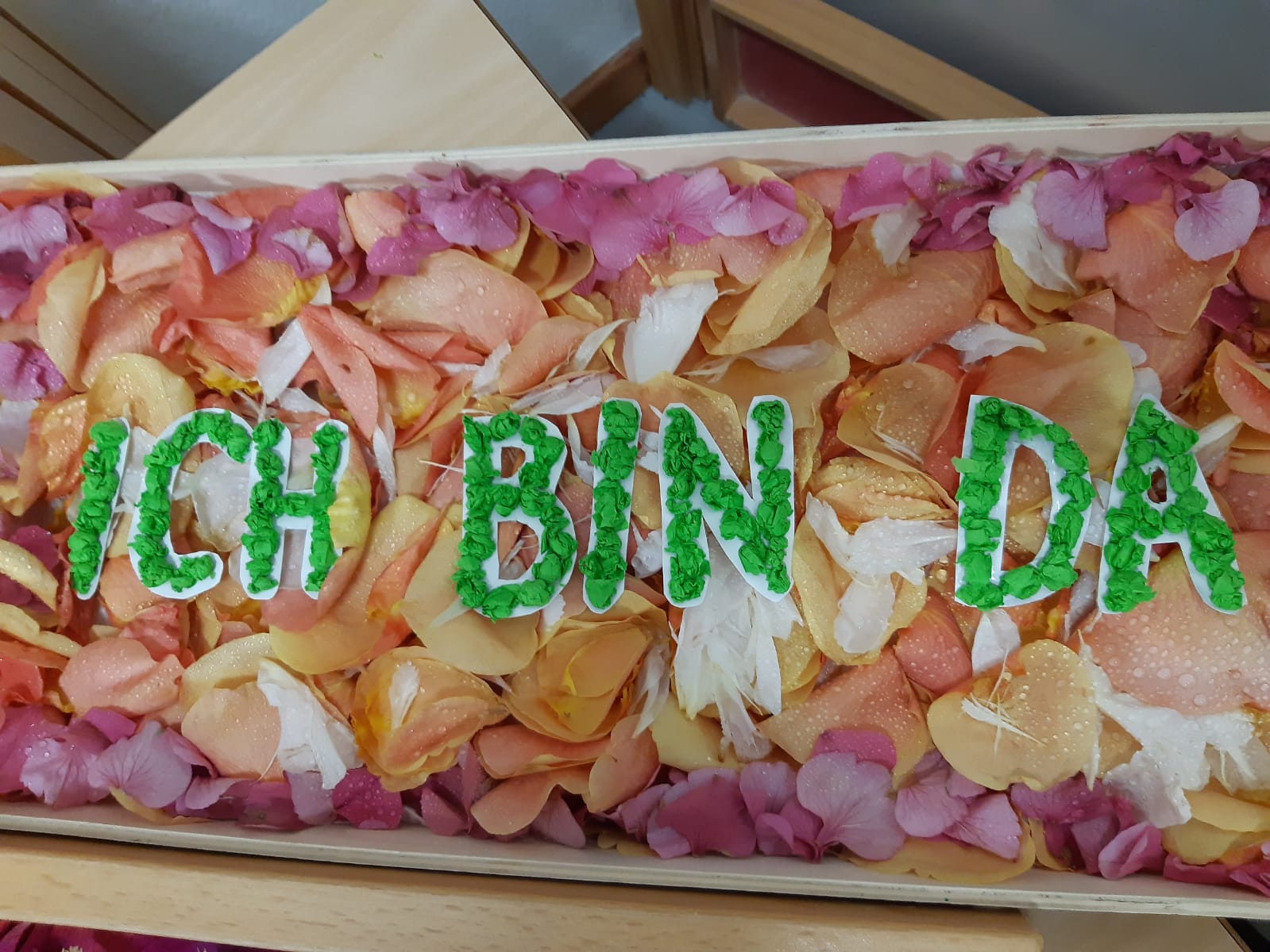 Am Dienstag vor Fronleichnam legten die Zwergenkinder einen Blumenteppich mit dem Motto „Ich bin da“, um zu symbolisieren, dass Gott immer bei uns ist.