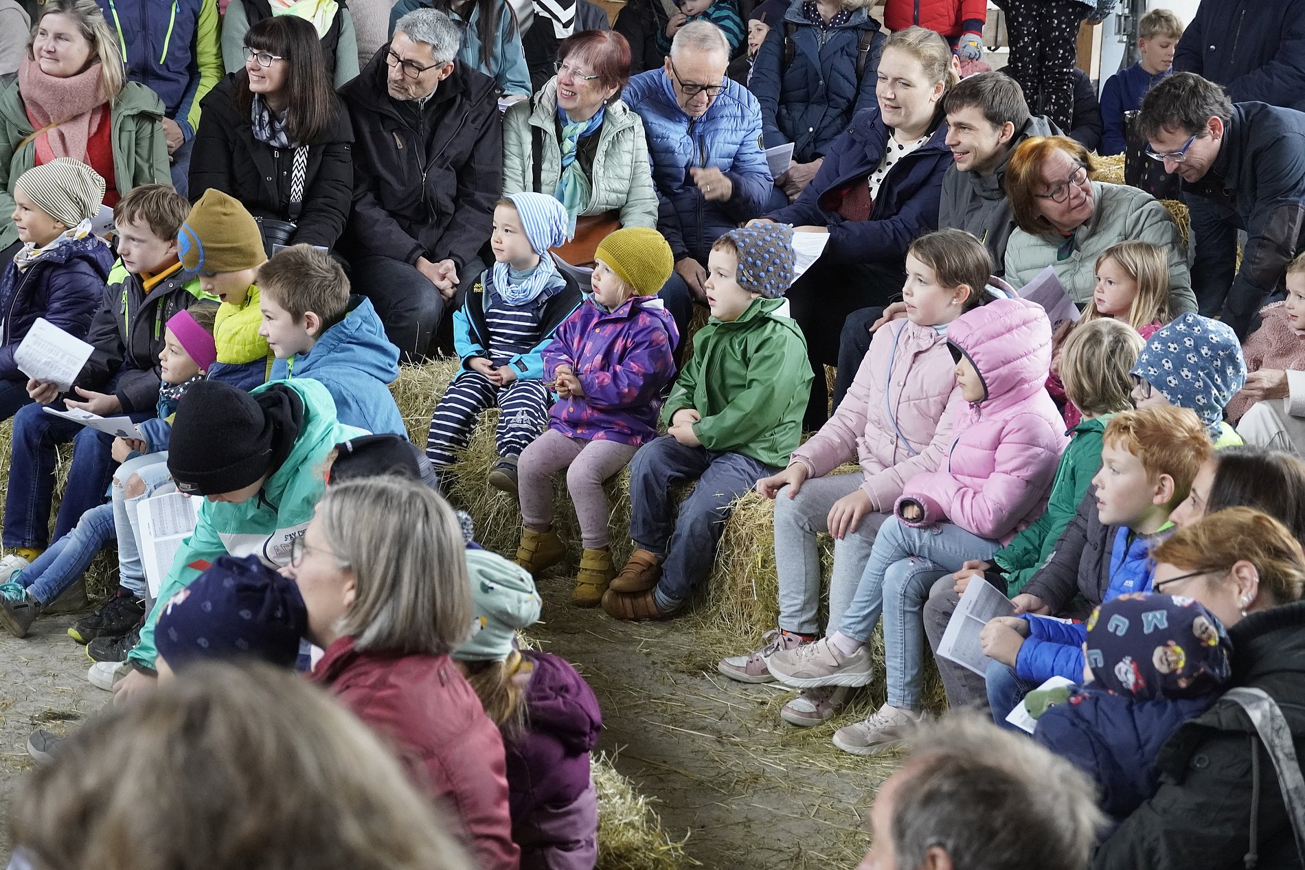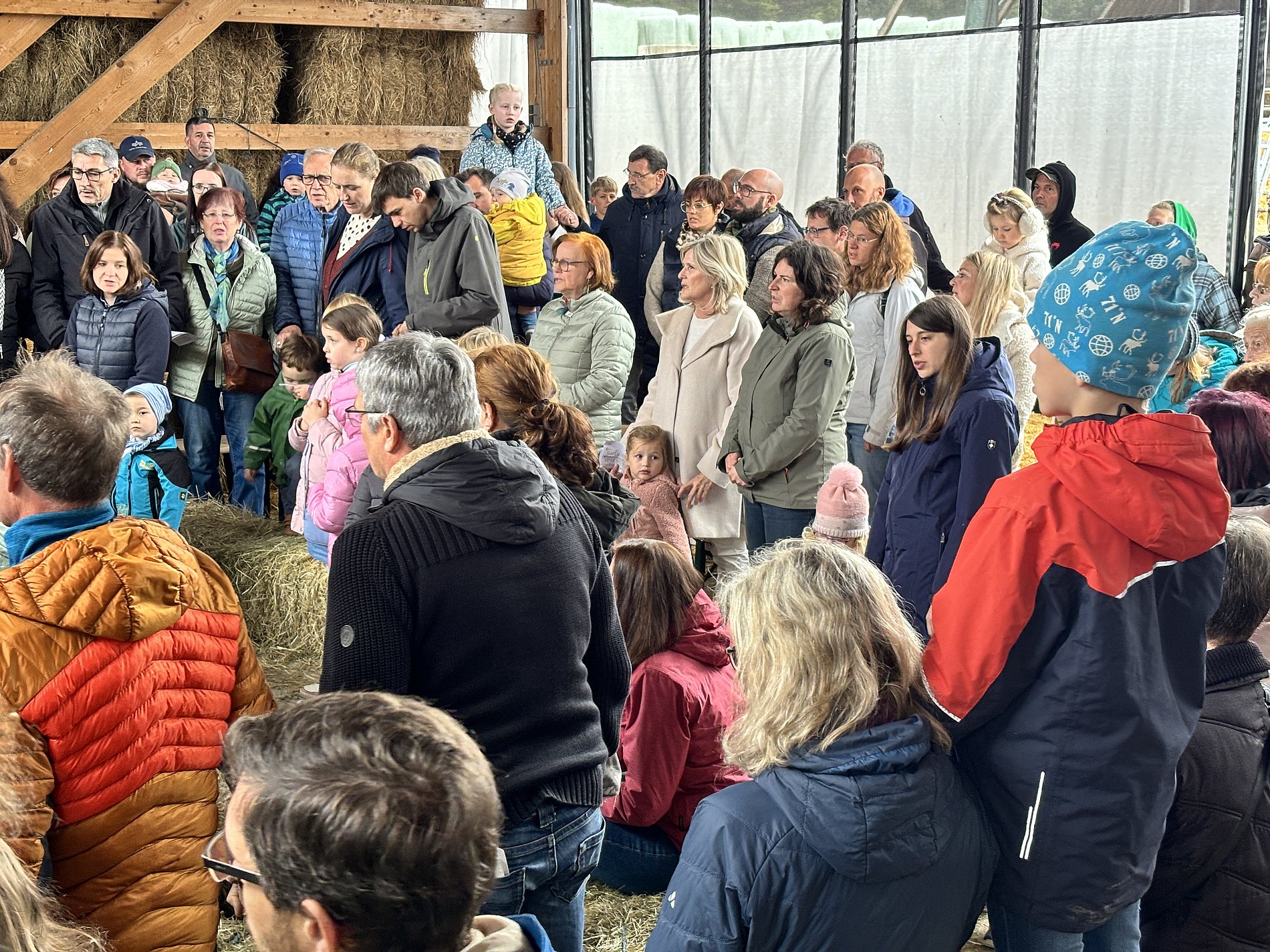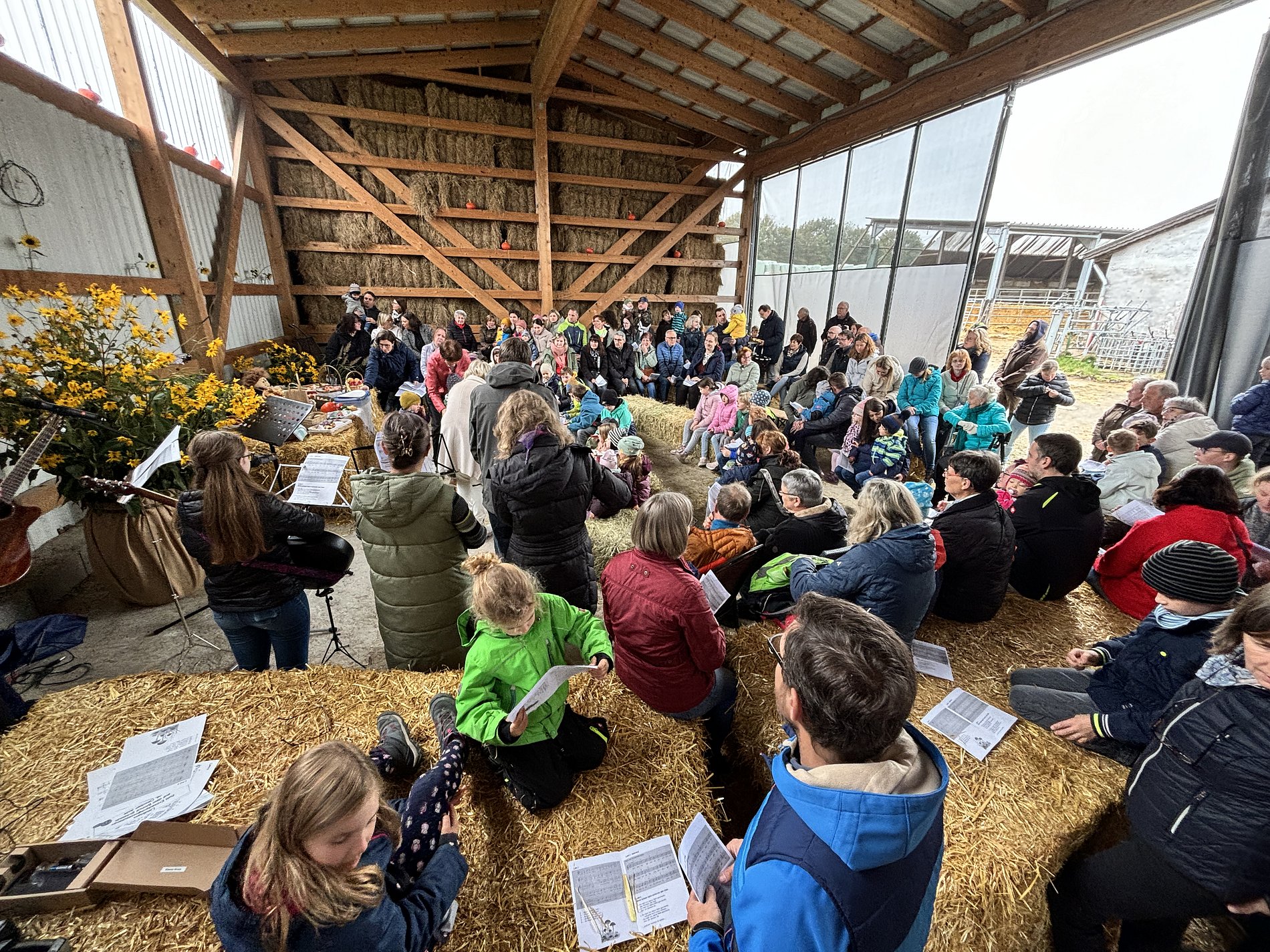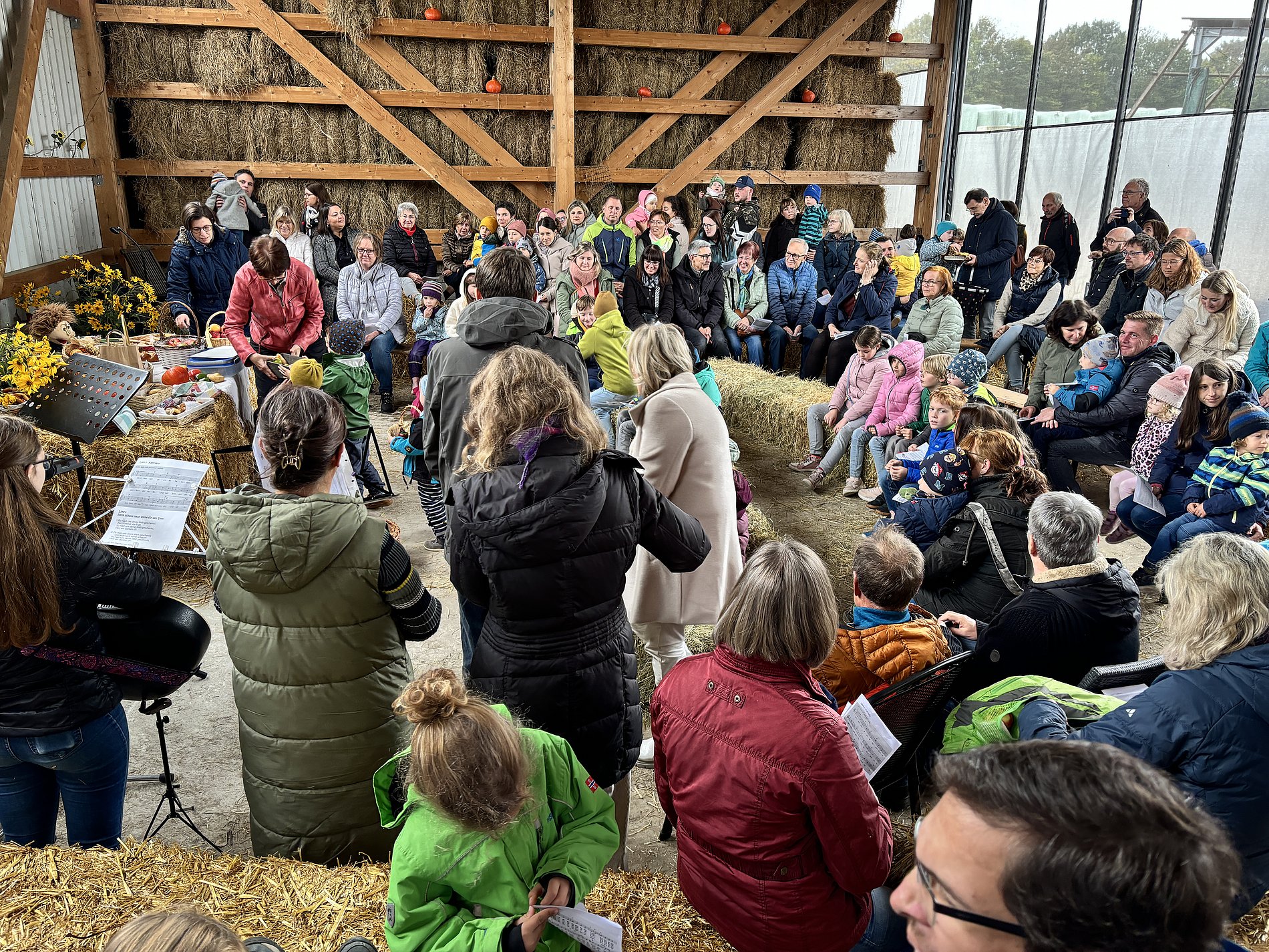 Der Biohof Schmidt in Baumbach war auch in diesem Jahr der perfekte Ort für den Kinderwortgottesdienst zu Erntedank. Mit viel Liebe hatte Familie Schmidt einen Stall mit großen Heuballen, Kürbissen und bunten Blumensträußen vorbereitet. Die zahlreichen Kinder hatten für den Erntedankaltar reichlich Obst und Gemüse mitgebracht.