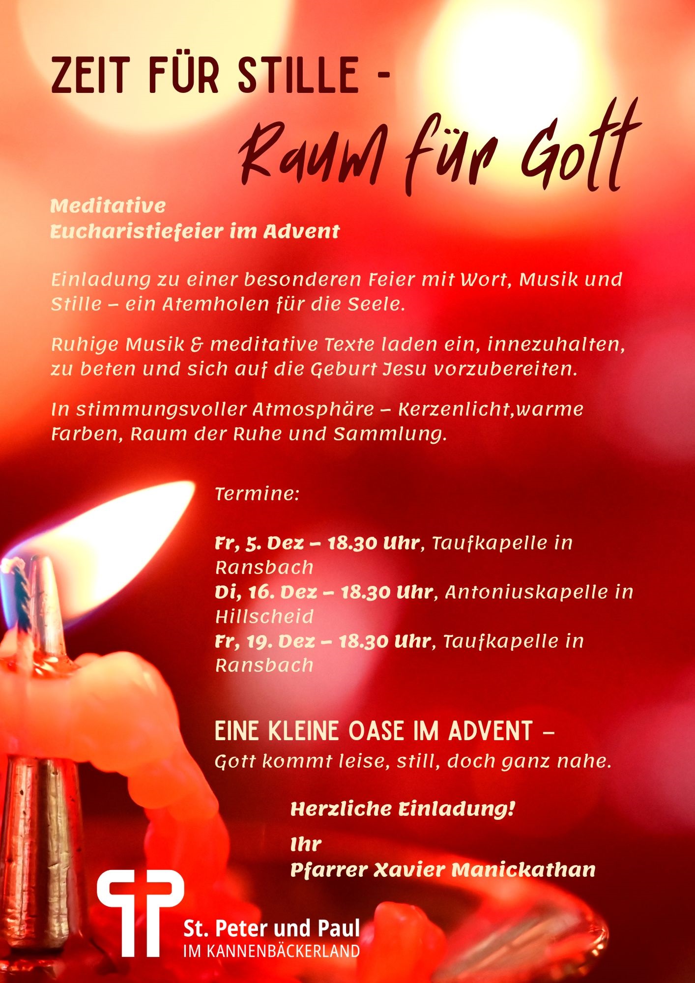 Herzliche Einladung zu den meditativen Eucharistiefeiern im Dezember - eine besondere Feier mit Wort, Musik und Stille - ein Atemholen für die Seele